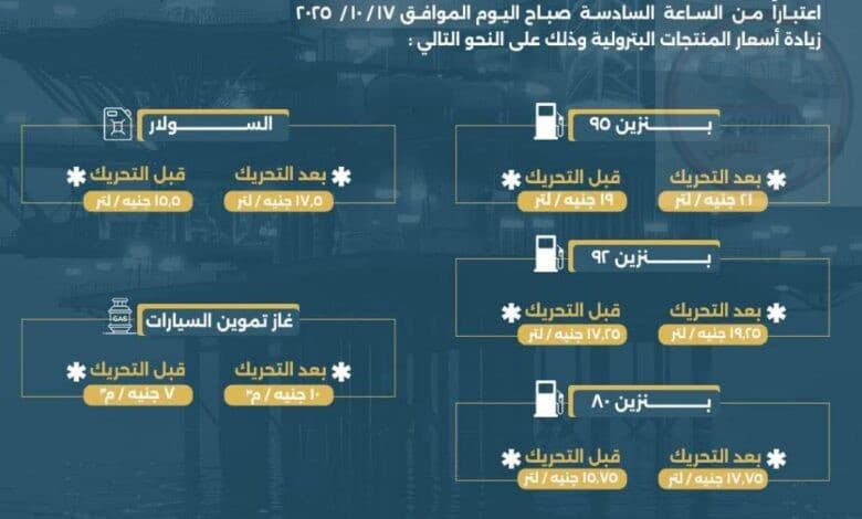 أعلنت لجنة التسعير التلقائي للمنتجات البترولية صباح اليوم الجمعة 17 أكتوبر 2025، عن رفع أسعار الوقود بمختلف أنواعه، في إطار المراجعة الدورية التي تُجريها الحكومة كل ثلاثة أشهر لمواكبة تحركات الأسعار العالمية وسعر الصرف.