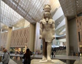 عند الدخول إلى المتحف في الواجهة كان في استقبالهم تمثال الملك رمسيس الثاني في مشهد رائع، يدل على الشموخ وعبق التاريخ.